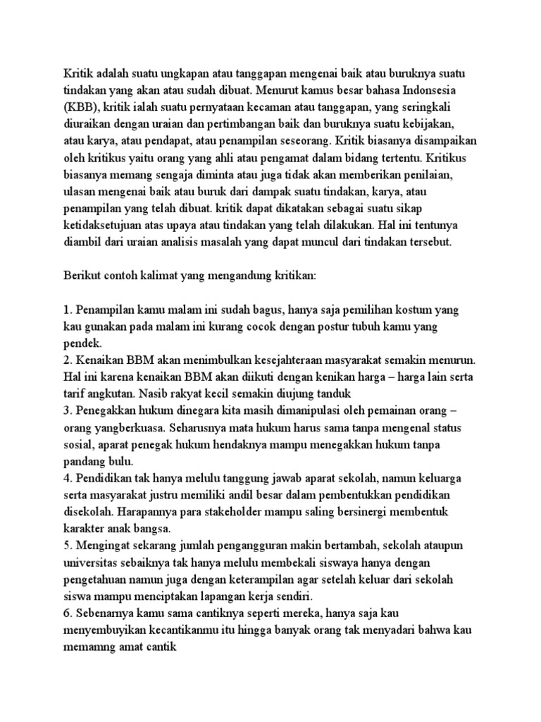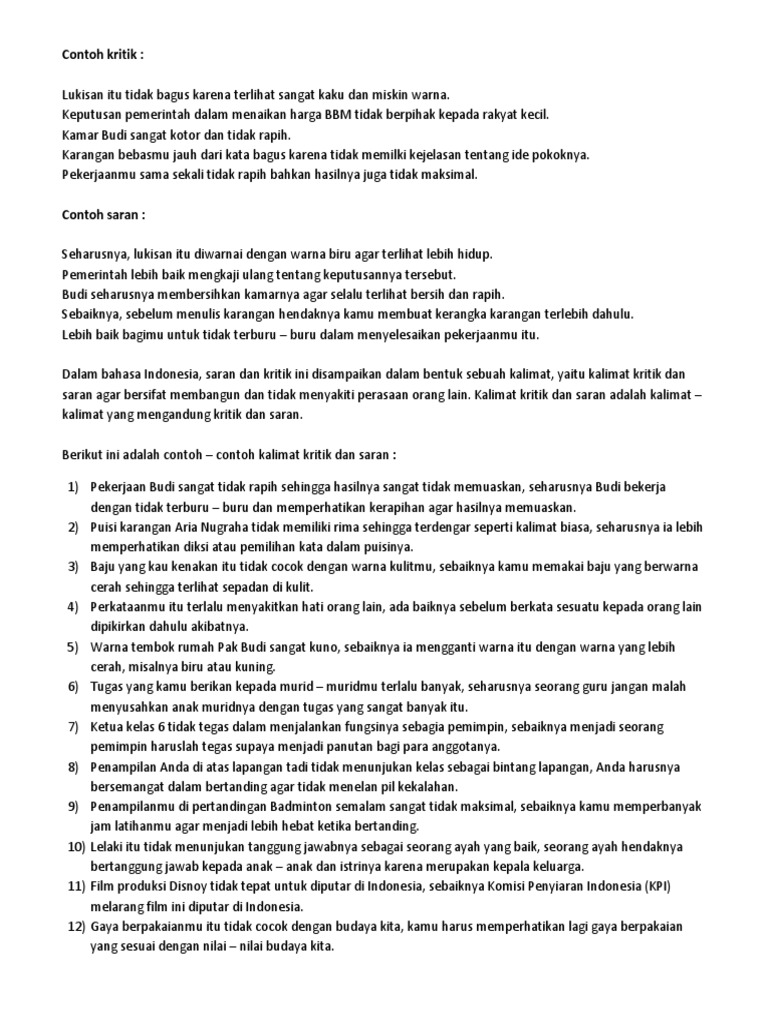 Contoh Kalimat Kritikan Pendidikan / Contoh Kalimat Kritikan Dan Pujian Aneka Macam Contoh : Nah, untuk menanggapi suatu pendapat.. Induk kalimat menyatakan sebab, dan anak kalimat menyatakan akibat; Contoh kalimat poster tentang kebersihan sekolah. Kita tidak boleh membuang sampah sembarangan, karena dapat menjadi penyebab penyakit dan jika menyumbat selokan akan menyebabkan banjir. Jokowi adalah presiden republik indonesia (fk) 3, london. Kalimat saran merupakan kalimat yang berupa pendapat/solusi terhadap suatu permasalahan atau objek.